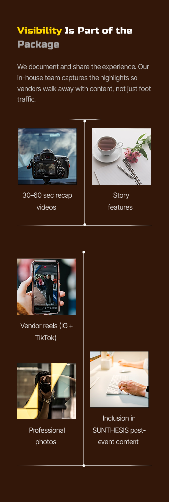 We document and share the experience. Our in-house team captures the highlights so vendors walk away with content, not just foot traffic.